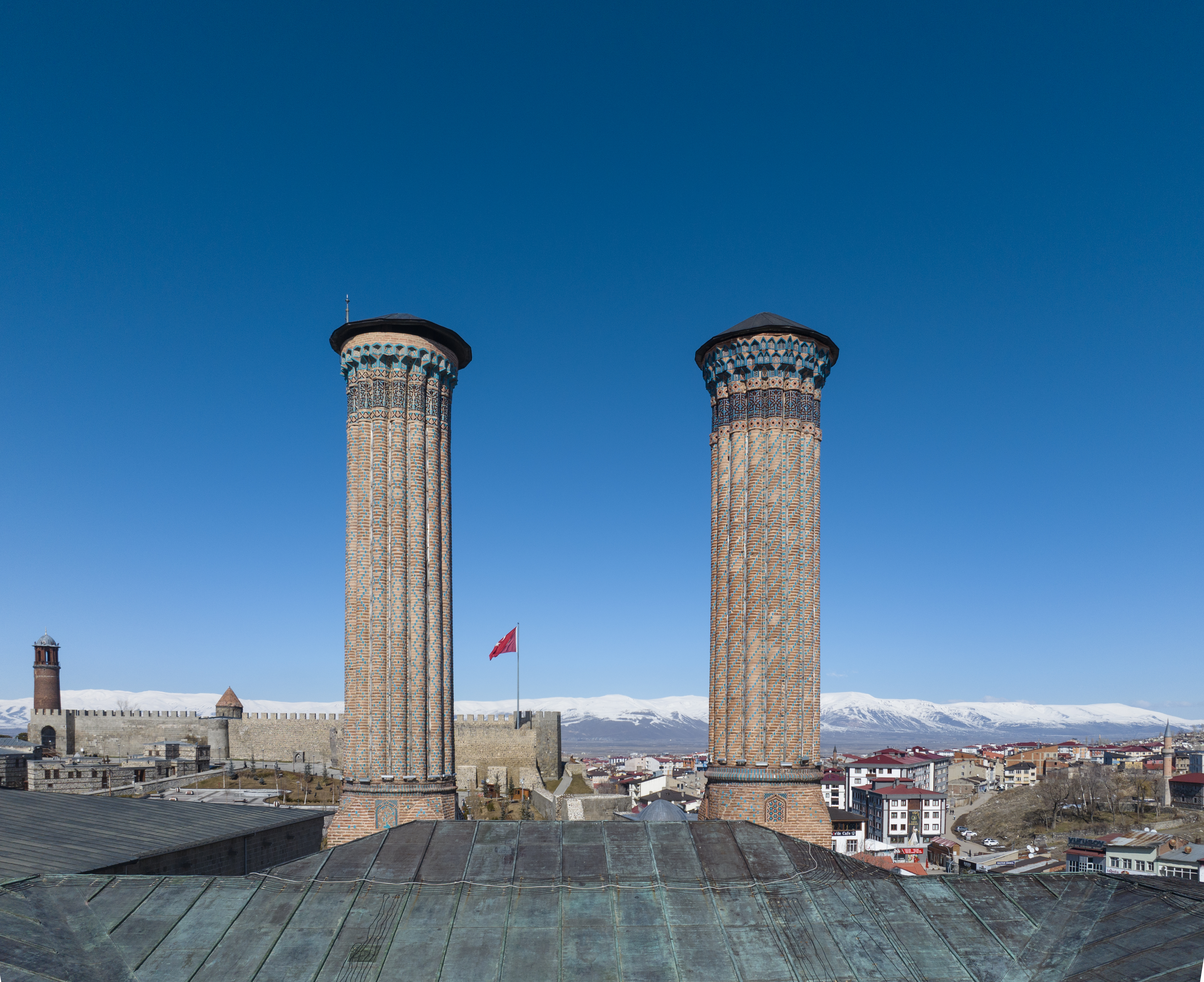 Η πανοραμική θέα από τους Προμαχώνες Αζιζίγιε (Aziziye) και Μετσιντίγιε (Mecidiye) κόβει την ανάσα, ενώ αξίζει επίσης μια επίσκεψη στα ιστορικά αξιοθέατα της πόλης όπως τους Διπλούς Μιναρέδες του Μεντρεσέ (Çifte Minareli Medrese) και τους Τρεις Τύμβους (Üç Kümbetler). Στα τοπικά εδέσματα περιλαμβάνονται το τσα κεμπάμπ (cağ kebap) και το κανταΐφ ντολμά (kadayıf dolma) (γεμιστό κανταΐφι).